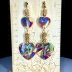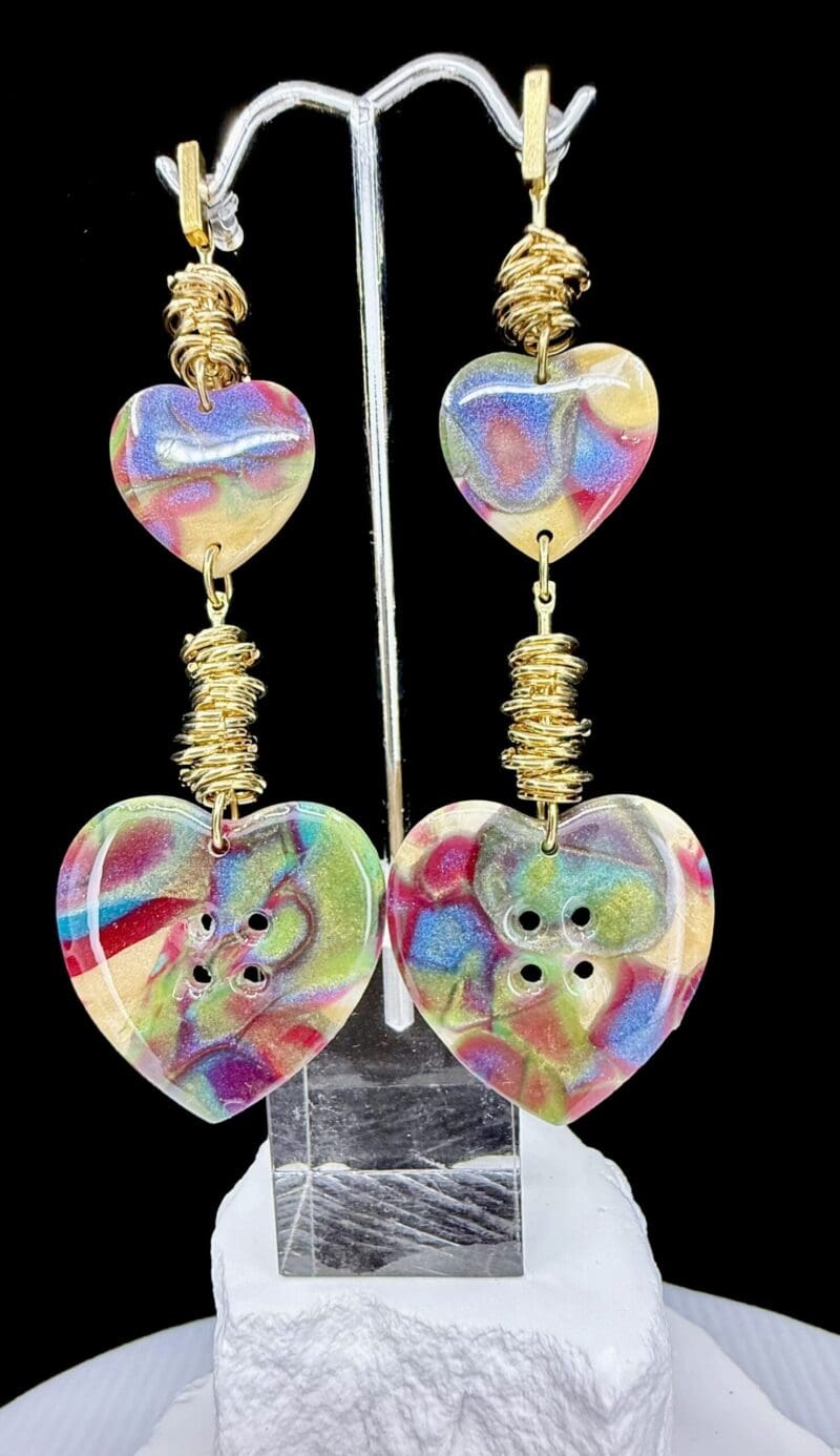Vibrant and full of motion, these Mokume Gane heart drop earrings capture the spirit of playful sophistication. Each pair is meticulously crafted from hand-mixed polymer clay, creating a swirling rainbow of layered pigments that shimmer beneath a smooth resin surface. The gold-toned coil accents add an extra layer of warmth and movement, echoing the rhythm of the clay’s natural flow.